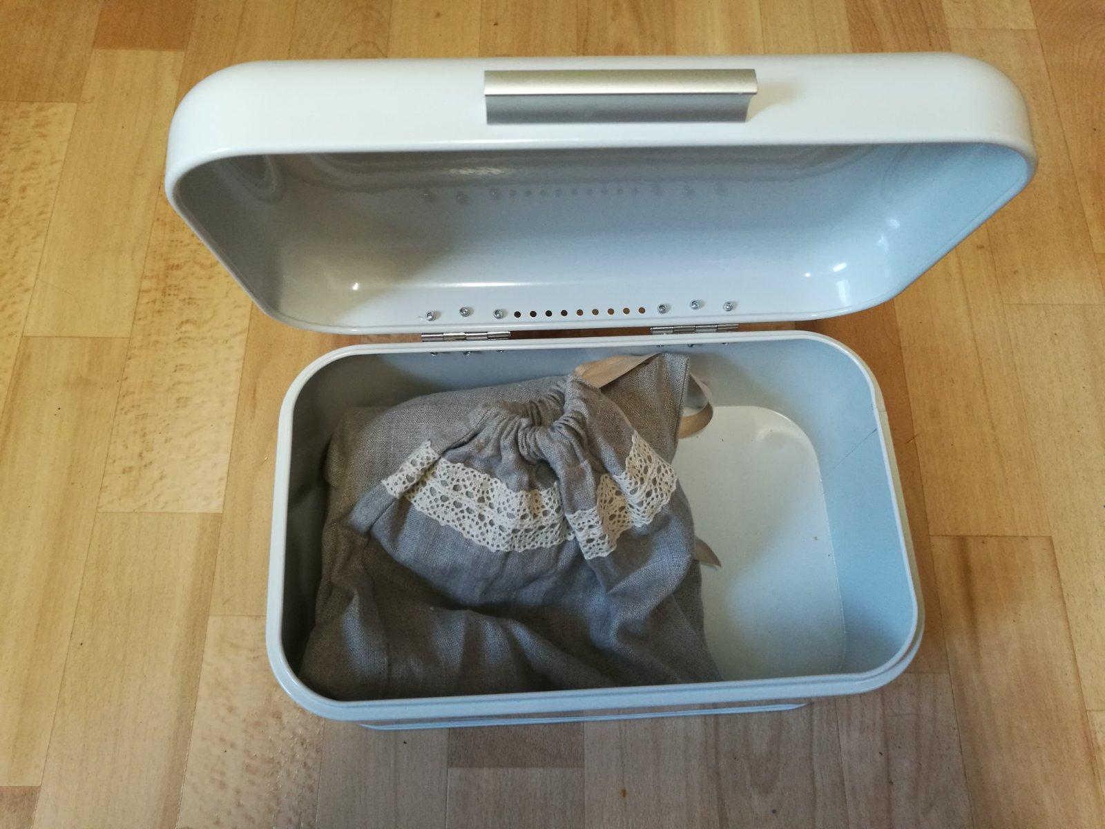 A v chlebníku namiesto igelitových sáčkov ľan 😉 a ak chodíte kupovať pečivo môžete si ho zobrať zo sebou a nakúpiť rovno do tohto prateľného vrecka ❤