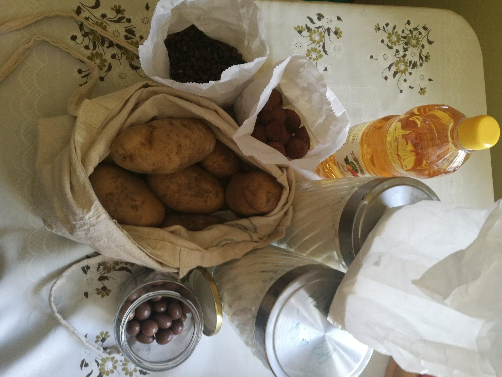 Ocot(povodná flasa ,ale capovaný,muka hladka pšeničná,manitoba,kava,kokosky,oriešky v čokoláde ,puer na pranie a odtoky ,zemiaky z trhu) dnešný nákup hotový ❤