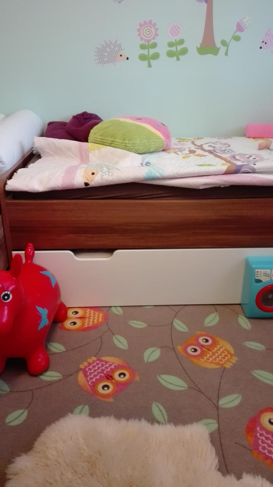 My mame,len inej farbe,podstate už 6 rokov,spokojnonost,ale pokial je len na podlahe,tak to vysuvne,lôzko behalo,posuvalo sa ked sa na ňom niekro v noci pretáčala,dali sme do celej izby koberec a uz je dobre.Predsa je to na koliečkach