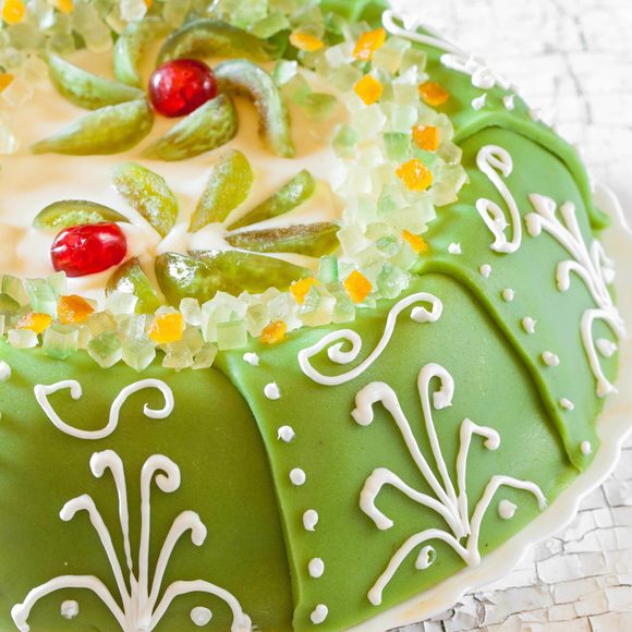 Tortu teda obložíme vyvaľkaným marcipánom a zdobíme kandizovaným ovocím.