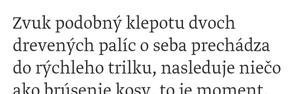 Zo zahĺbania v myšlienkach ma zrazu niečo vytrhlo. Zvuk. A Goričko ho počul tiež. Medzi stromami, tam kde už nebolo vidno, ozývalo sa rytmické ťukanie. Ak by som to mala k niečomu prirovnať, najviac mi to pripomínalo tie drevené paličky, čo učiteľka hudobnej dávala žiakom, ktorým nešla ani hra na triangel. V absolútnej tíšine lesa bolo počuť len dreveno-metalické ťuk-ťuk (chvíľu pauza) ťuk-ťuk (chvíľu pauza) ťuk-ťuk. Nevedela som odhadnúť, ako ďaleko je zvuk, no raz išiel z ľavej strany, potom spredu a onedlho už znel sprava. Akoby niekto, alebo niečo chodilo v polkruhoch okolo. Že sa mi to len nezdá, mi potvrdil Goričko otáčajúci hlavu v smere ťukania.