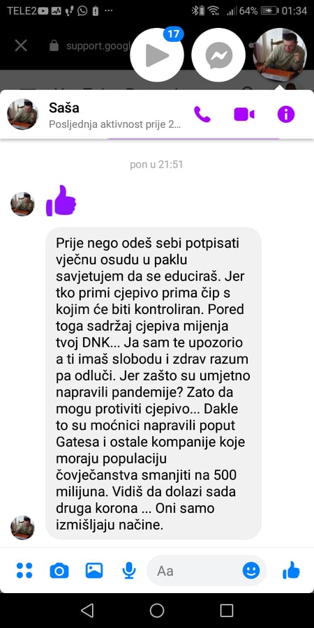 Tu je preklad: "Predtym, než si odideš podpisať večné zatratenie v pekle, radim ti, aby si sa edukoval. Lebo ten kto príjme očkovanie, príjma aj čip a bude kontrolovaný. Okrem toho, obsah očkovania ti mení DNA....Ja som ťa upozornil a ty máš slobodu a zdravý rozum, tak sa rozhodni. Prečo by inač umelo vytvorili pandémiu? Preto, aby mohli vnutiť očkovanie...Čiže všetko to spravili mocní ľudia, ako napr. Gates a ostatné firmy, ktoré musia zmenšiť počet ľudstva na 500 miliónov. Vidíš, že teraz prichádza druhá korona....Oni iba vymýšľajú spôsoby." ....