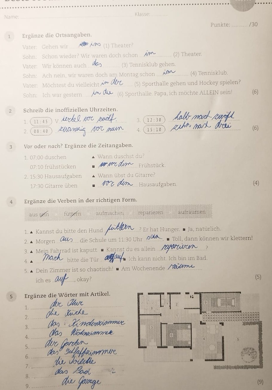 Cvičenie 5 má dobré. V cvičení 4 druhá veta treba doplniť "ist" a na konci "aus". V cvičení 3 v tom druhom má byť "vor den". V cvičení 2 trojka má byť "halb eins". A v prvom cvičení v tretej vete "ins" a piatu a šiestu vymeniť