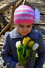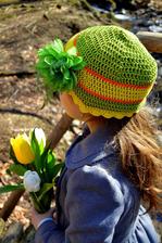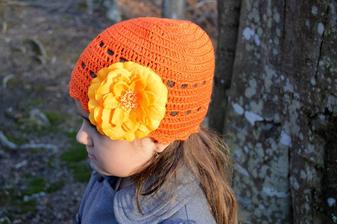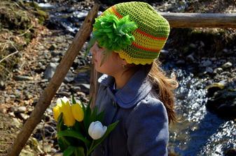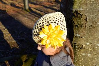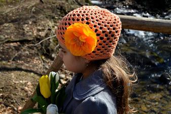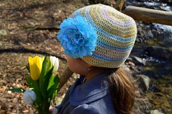 Háčkované čiapočky s veľkými odopínateľnými kvetmi.