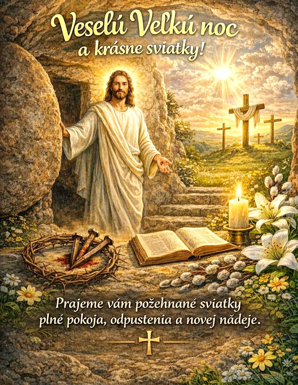 Láska Zeleného štvrtku, viera Veľkého piatku, nádej Bielej soboty a víťazstvo Veľkonočnej nedele, nech Vás posilní a naplní pokojom a dôverou v kruhu rodiny.Pekné Veľkonočné sviatky Vám prajeme 🌹