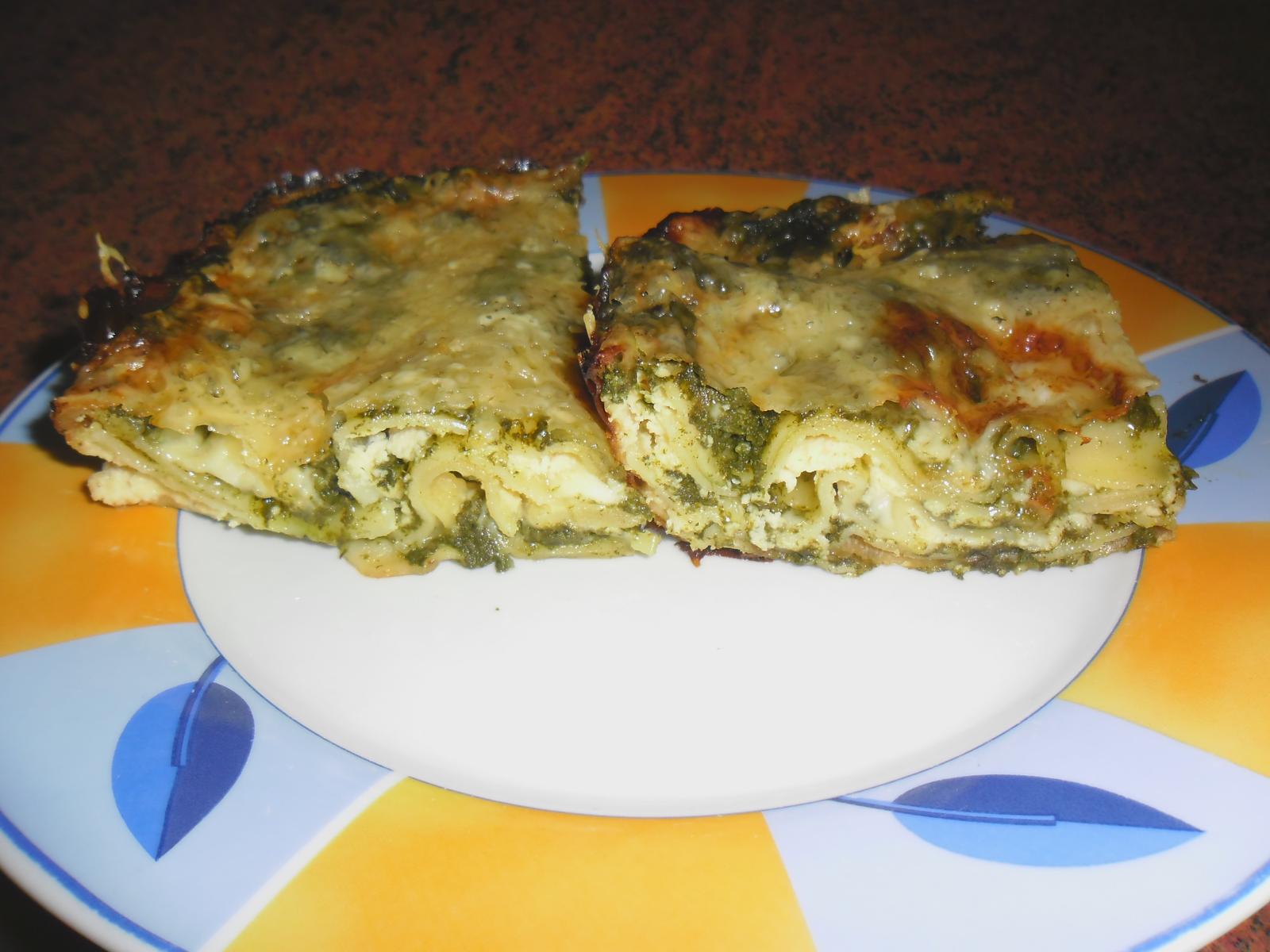 Obdélníkovou zapékací formu vymažeme důkladně máslem. Dno formy vysteleme plátky lasagní /nejlépe těch, které se nemusí předvařit/. Na vrstvu lasagní rozetřeme část špenátové náplně, potom poukládáme plátky sýra, na ně natřeme část sýrové náplně a následuje zase vrstva lasagní. Takto pokračujeme do vyčerpání surovin. Vrchní vrstva je špenátová náplň. Na ni nastrouháme tvrdý sýr. Pro zjemnění přidáme úplně nahoru několik kousků másla. Zapékáme v trouběna 200 stupňů asi 40 minut. Necháme mírně vychladnout.