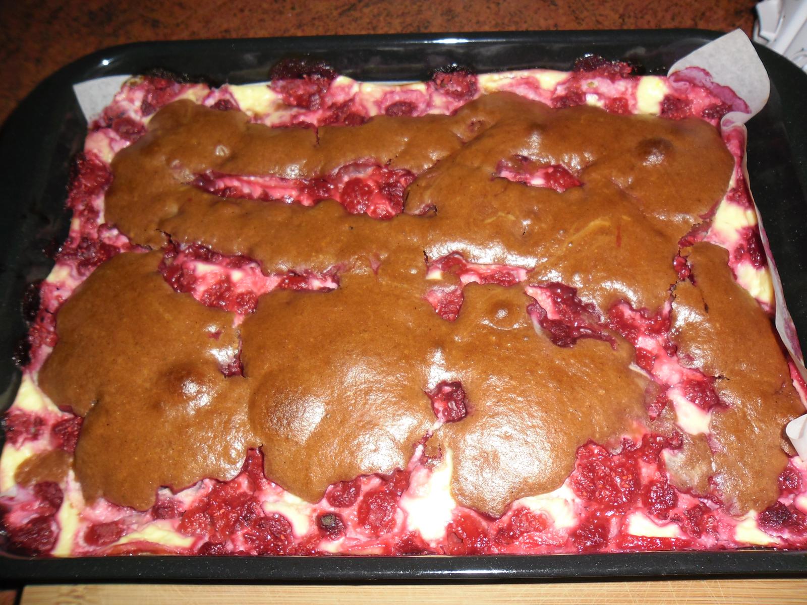 Do zbylého těsta přimícháme kakao a nalijeme na ovoce. Pečeme při 200 ° cca 30 minut.