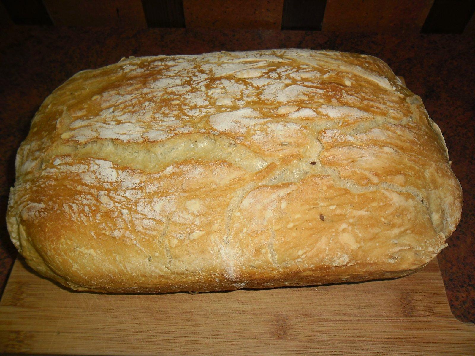 Postup : Všechny suroviny dáme do větší mísy a smícháme jen aby se všechny dobře propojily. Zakryjeme utěrkou a necháme 6 - 8 hodin kynout /nejlépe přes noc/. Po vykynutí ho na válecí podložce rukama roztáhneme na obdélník a poskládáme shora i zespoda do poloviny a zleva i zprava do poloviny. Opatrně přendáme na plech s pečícím papírem, těmi sklady dolů a necháme znovu 1 hodinu kynout. Necháme si rozehřát troubu na 220 stupňů a dáme si do ní rozehřát nádobu s víkem, ve které budeme chléb péct. Po hodině kynutí přemístíme chléb i s papírem do té rozpálené nádoby s víkem. Pečeme zakryté na 220 stupňů asi 30 minut, potom odkryjeme a dopékáme na 180 stupňů asi 15 minut. Upečený chléb dáme vychladnout na mřížku a zakryjeme bavlněnou utěrkou.