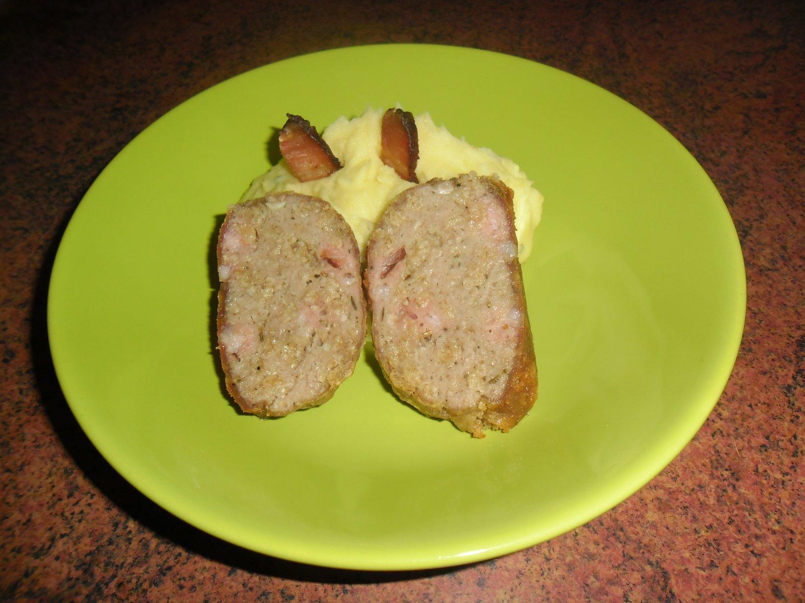 Suroviny : mleté maso 500 g ovesné vločky 150 g vegeta 2 lžičky sůl, mletý pepř, česnek, majoránka, drcený kmín podle chuti vejce 1 kus uzená slanina 35 g sádlo trochu středně velká cibule 1 kus