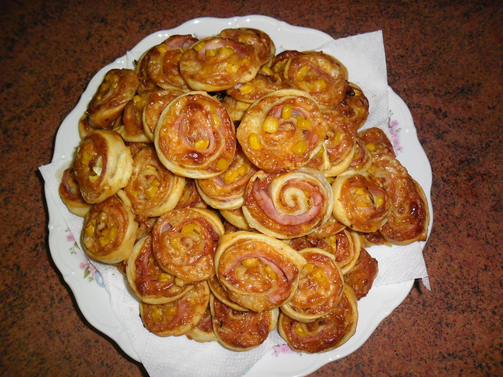Postup : Těsto rozválíme na dva velké pláty velikosti velkého plechu. Potřeme tenkou vrstvou drcených rajčat smíchaných s kořením – bylinkama /ty rajčata s bylinkama necháme chvíli vydusit na pánvi/. Posypeme sýrem. Poklademe plátky šunky, tak, že uprostřed vytvoříme podélný pruh. Aby se šunka objevila v každém šneku, nemusíme poklást celou plochu. Posypeme cibulkou a kukuřicí. Plát opatrně podélce svineme do válečku jako roládu, dbáme na to, aby byl svinut pevně, aby se šněčci při krájení a manipulaci nerozplétaly. Krájíme šněčky asi 1 cm široké a klademe je na plech vyložený pečícím papírem nebo do papírových košíčků. Pečeme v troubě na 200°C dokud nenaběhnou a nezezlátnou