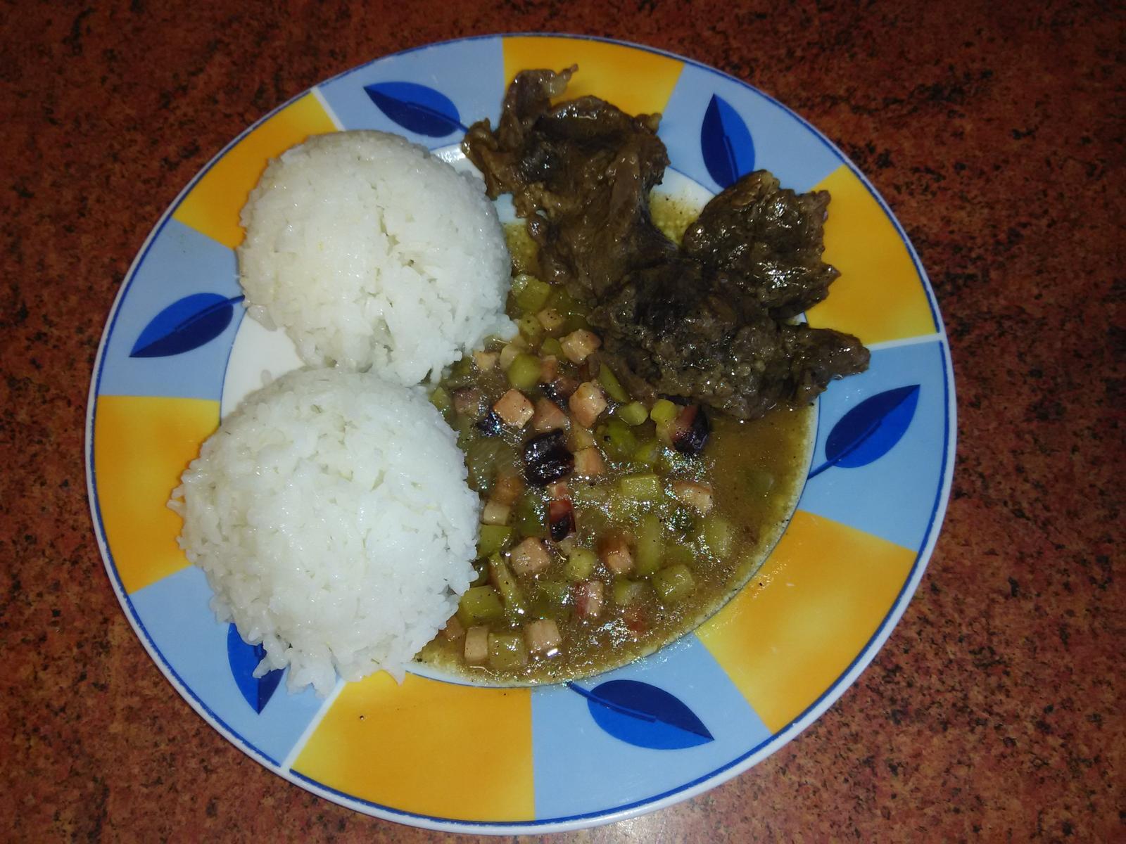 Postup : Maso nakrájíme na tenší plátky, osolíme, opepříme, z jedné strany potřeme hořčicí. V hrnci si rozpálíme sádlo a plátky masa v něm narychlo z obou stran zatáhneme. Maso vrátíme zpět do hrnce, podlejeme horkou vodou a dusíme asi 1,5 hodiny, doměkka. Na pánvi si osmahneme dorůžova cibuli a na ní slaninu nakrájenou na kostičky. Okurky si nakrájíme na kostičky. Když je maso úplně měkké, vytáhneme je z hrnce, přilejeme tolik horké vody, kolik chceme šťávy a přivedeme k varu. Do toho přidáme cibulovo-slaninovou směs a okurky a asi 5 minut provaříme. Potom můžeme přihustit moukou rozmíchanou ve vodě a dochutíme solí, pepřem. Vrátíme tam maso a necháme spolu krátce prohřát. Příloha - dušená rýže.