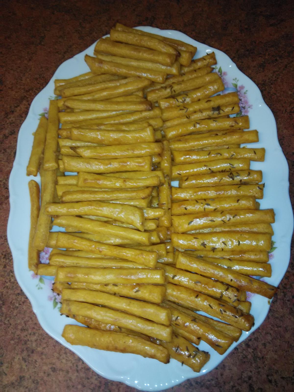 Potom vyválíme na asi 5 mm silný plát a povykrajujeme tyčinky. Dáme je na plech s pečícím papírem, potřeme vajíčkem, posypeme semínky a pečeme ve vyhřáté troubě na 180 stupňů asi 15 minut.