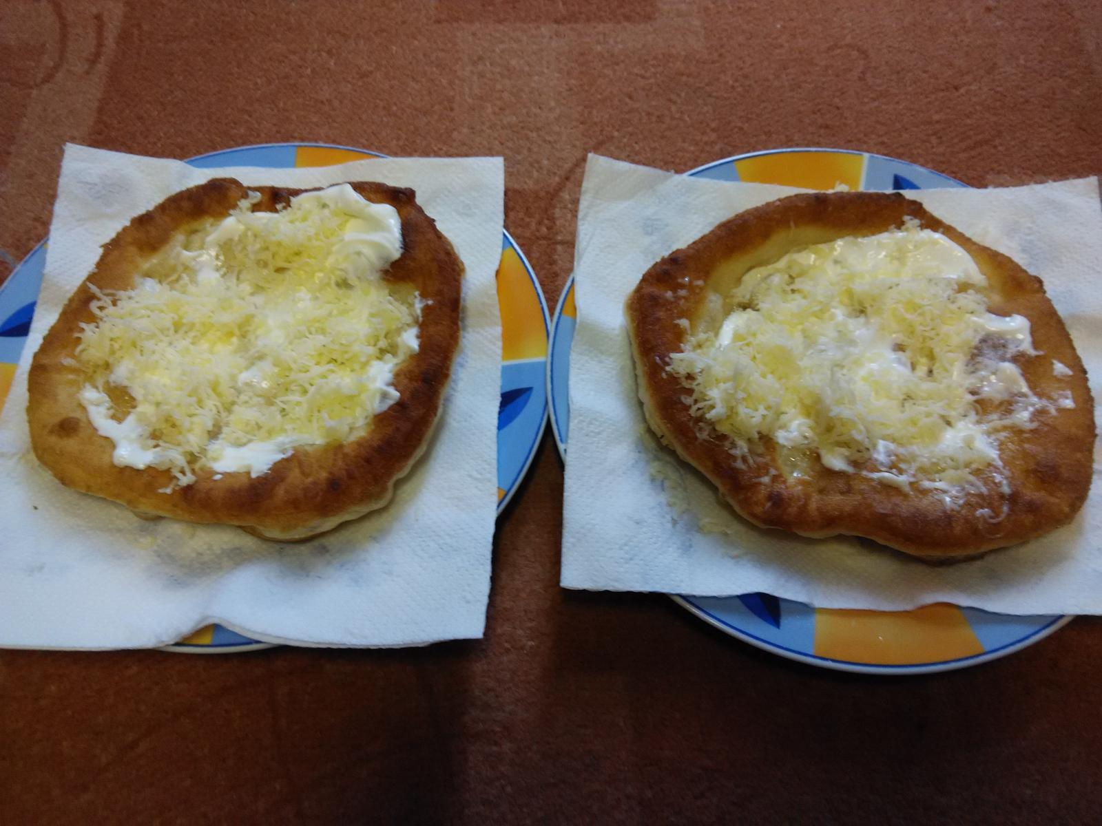 Postup : Ze surovin na těsto nám domácí pekárna vymíchá a vykyne těsto. Těsto vyválíme zhruba na 1 cm tloušťku a z něho pak vykrajujeme kolečka jak chceme velké. Ty necháme pod utěrkou ještě 20 minut nakynout. Rozpálíme si na pánvi olej (vyšší vrstvu - langoše musí plavat), potom bereme jednotlivé kolečka, rukama je ještě povytahujeme a opatrně vkládáme do rozpáleného oleje. Smažíme z každé strany asi minutu. Potom papírovými utěrkami odsajeme přebytečný olej, potřeme směsí olej+voda+prolisovaným česnek+sůl a nahoru pomažeme kysanou smetanou a zasypeme sýrem.