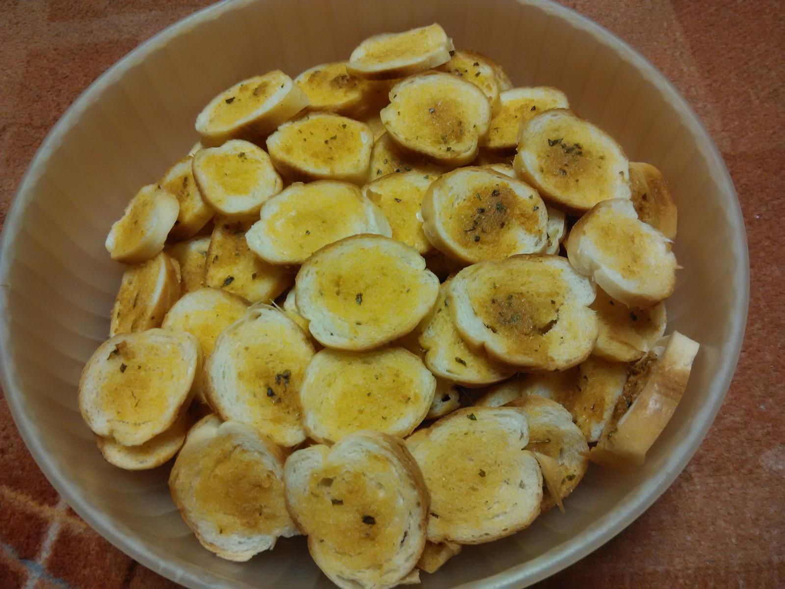 Rohlíky nakrájíme na tenké (asi 3 mm) kolečka. Rozložíme na plech s pečícím papírem a každé kolečko potřeme rozpuštěnými máslem smíchaným s česnekem, gril. kořením a solí.