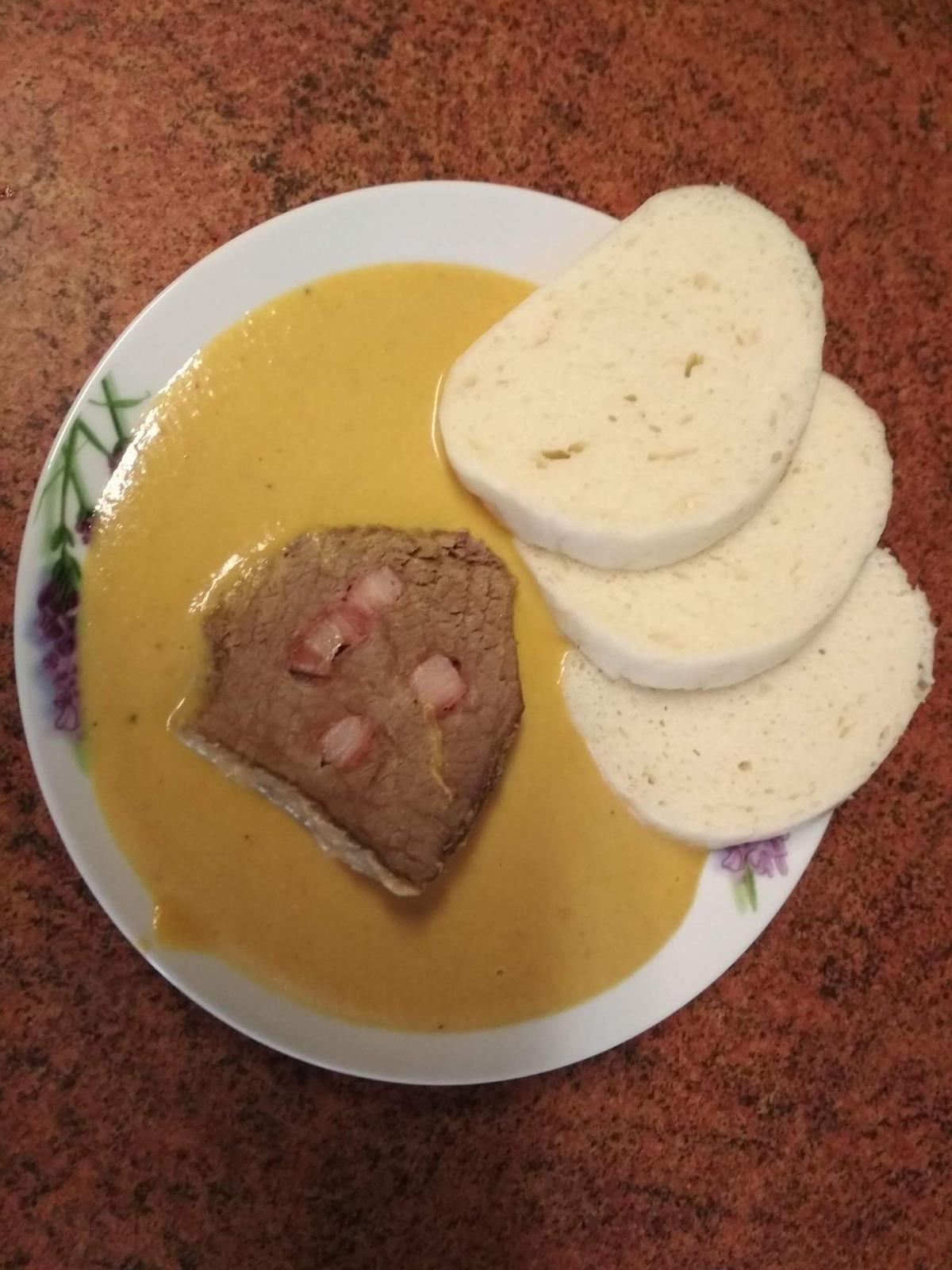 Maso nakrájíme na plátky a podáváme s knedlíkem.