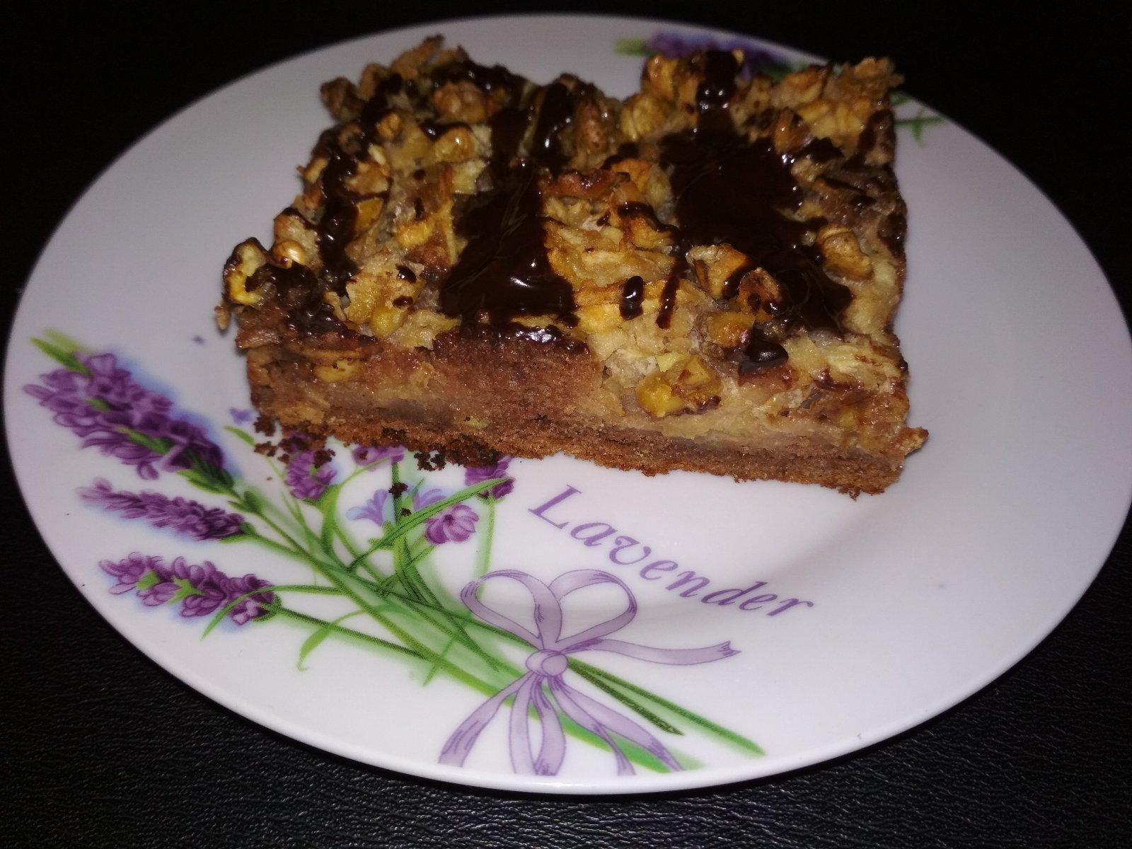 Žĺtky s cukrom a olejom vymiešame do peny, pridáme múku zmiešanú s práškom do pečiva a kakaom, mlieko a nakoniec zamiešame sneh z bielkov. Cesto vylejeme na vymazaný a vysypaný plech a po celej ploche na surové cesto navrstvíme nastrúhané jablká a posypeme ich nahrubo nasekanými orechmi. Pečieme vo vopred vyhriatej trúbe (200 °C) 20 minút. Zatiaľ si pripravíme smotanovú zmes: vajíčka vymiešame s cukrom do peny, pridáme smotanu a premiešame. Čiastočne upečený koláč po 20-tich minútach vytiahneme a polejeme smotanovou zmesou. Dáme nazad do trúby na 20 minút dopiecť. Z rozpustenej čokolády, masla a vody si pripravíme čokoládovú polevu, ktorou ozdobíme dopečený koláč. Vychladnuté nakrájame.
