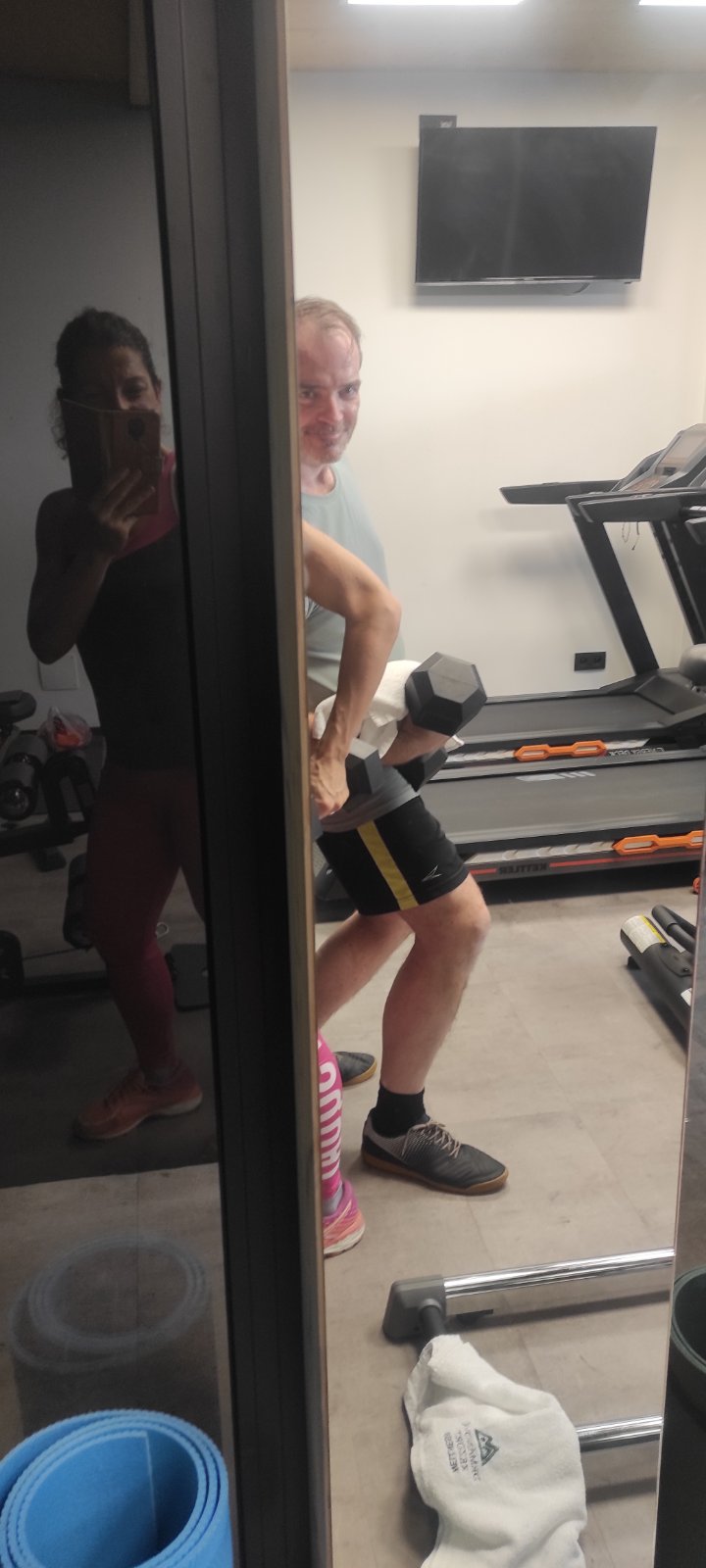 Ja som sa rozhodla už v piatok využiť fitness. Ako prvé ma prekvapili ne-šatne. Síce skrinky boli, ale v podstate riešené na chodbe (vedľa recepcie, pred vstupom do šatní do wellnessu). Čiže, pri prezliekaní diskomfort. Fitko sú dva bežecké pásy, jeden rotoped a jeden orbitrek. Jedna šikmá lavička a stojan s činkami od 1kg po tuším 20. Zacvičiť sa dá. Miestnosť tak maximálne pre dvoch. Beh na páse či iné cvičenie - keď sa zotmelo, tak človek bol ako vo výkladnej skrini.