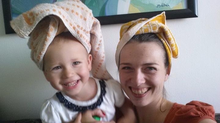 Ma 2 roky a aka je vybabrana. Hresim ju, aby uz bola ticho, lebo Milanko uz chce spat. Ona stichne a zrazu za ku mne nakloni a hovori: Bubim Ta, manka. (Lubim Ta,mamka). No a teraz sa tvar prisne. Mala potvorka.
