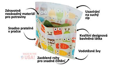Znovu použitelné sáčky na svačinky si zamilujete od prvního použití. Do sáčku můžete balit tradiční české svačiny: chleba, toasty, piškoty, drobné ovoce a zeleninu (nakrájená jablíčka, papriku, mrkev, salát apod.) Do sáčku se vejde menší český krajíc chleba anebo velký překrojený napůl, houska, toastový chleba apod. Společnost Planet Wise požádala o udělení patentu pro tento výrobek. Z vnější strany je sáček vyroben z kvalitní bavlněné látky, vnitřní strana je laminovaná (hladký nepromokavý povrch).