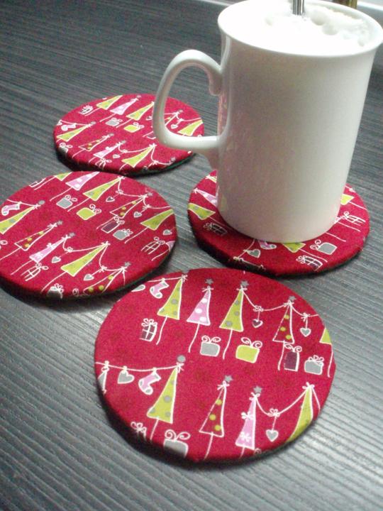 Budeme potrebovať: vianočnú látku 30 x 30 cm, filc na podlepenie spodnej časti, lepidlo, korkové podložky (kúpila som v IKEA, volajú sa Avskild, 4ks stoja 0,49€, priemer je 10cm)