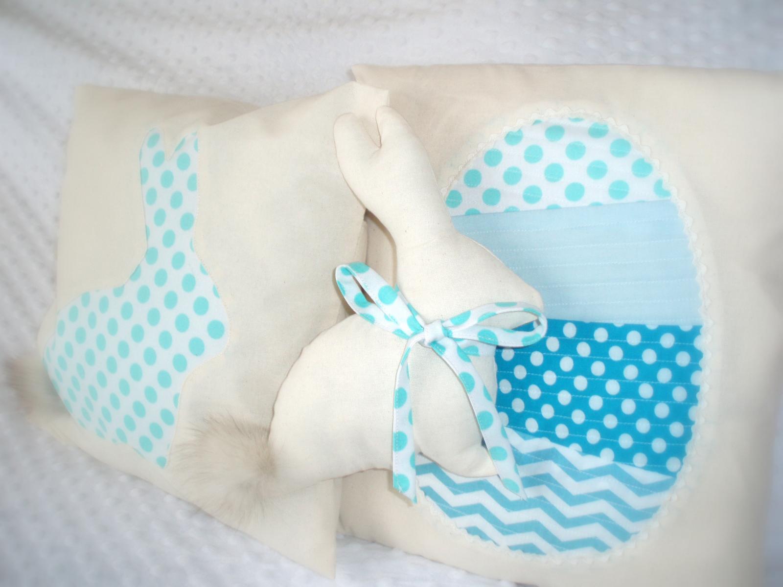 Rozhodla som sa pre vankúšik a zajka, ktorý akoby z vankúšika práve vyskočil. Keď som už bola v ráži, pridala som ešte jeden vankúšik s veľkonočným vajcom, pri ktorom ale nebudem popisovať postup, lebo je to presne to isté, čo som robila minule so srdcovým valentýnskym, ibaže v modrom. Ak si chcete pozrieť presný postup, pozrite si môj predchádzajúci žurnál.
