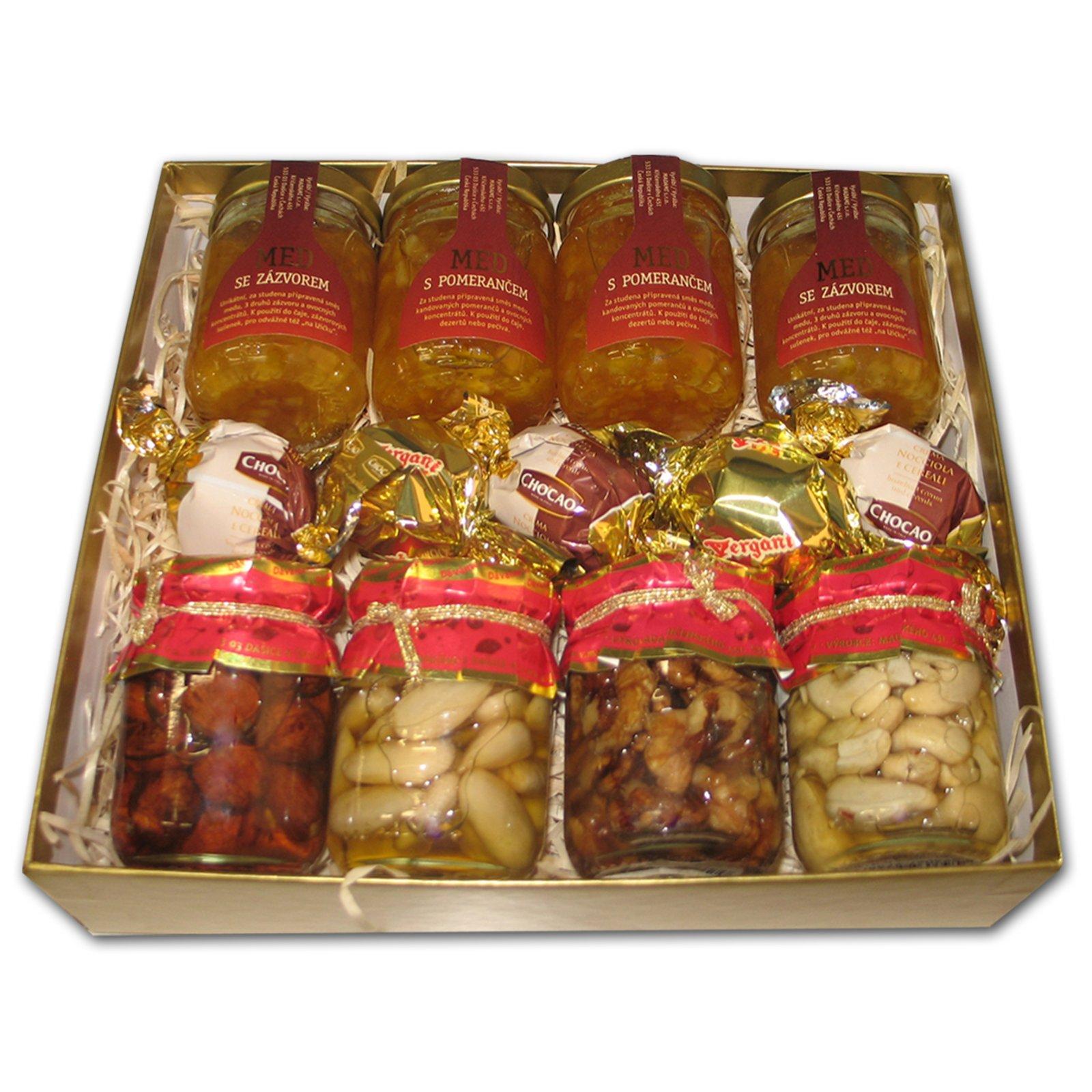 autorPekný deň, táto zlatá kazeta s medovými pochúťkami obsahuje: 2x med s pomarančom (po 76g) a so zazvorom (po 76g), a ochutené medy s lieskovými orieškami s kešu orieškami, mandľami a vlašskými orechami (4x66g) a tiež Talianske pralinki Sorini. Cena za celé darčekové balenie je 18,- Eur.