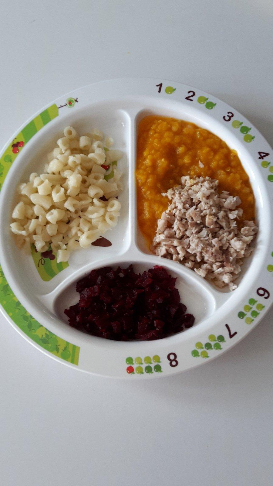 Kralik,sosovicovy privarok s tekvicou,mrkvou a mletou rascou,kolienka,cvikla.