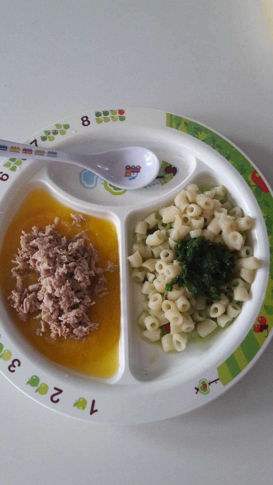 Jahnacinka na zeleninovej omacke(cuketa,mrkva,kalerab);kolienka s pestom z medvedieho cesnaku s olivovym olejom.