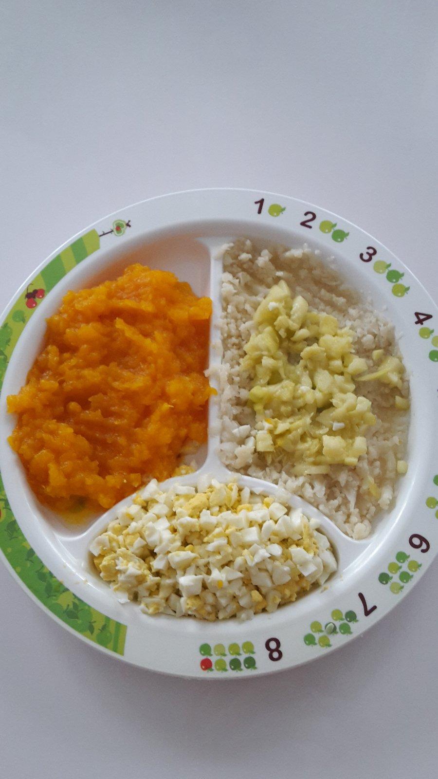 Cele vajicko na tvrdo;batatovo-tekvicove pyre;karfiol s cuketkou.