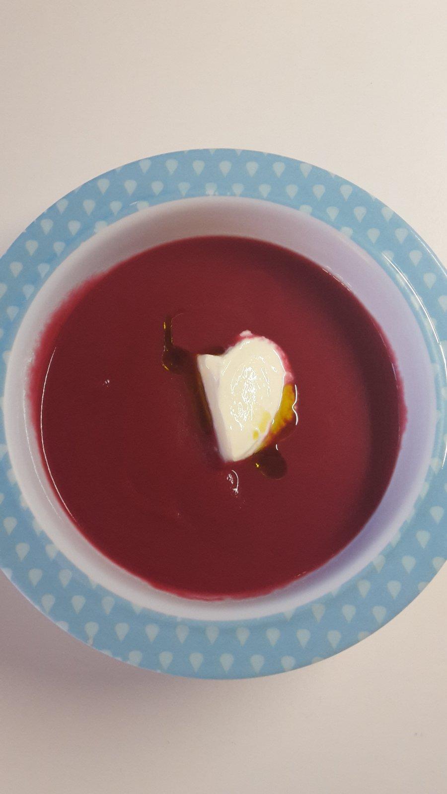 Cviklovo-tekvicovy krem zahusteny zemiakom s kyslou smotanou a avokadovym olejom.