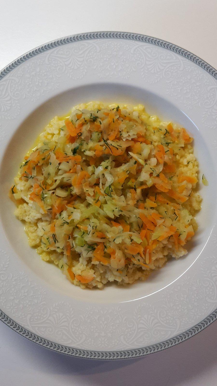 Psenoto s mrkvou cuketou mladou cibulkou koprom a kurkumou.