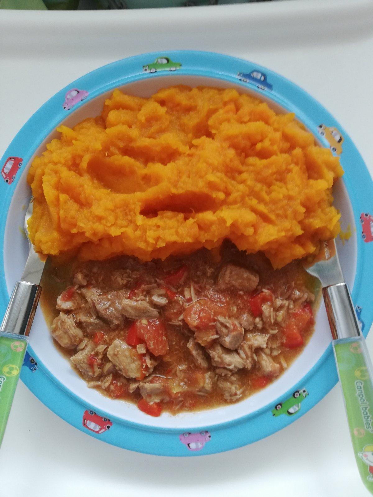 Dietny telaci gulasik na paradajkach s cervenou kapiou bez soli a korenia s hokaidovo mrkvovym pyre.