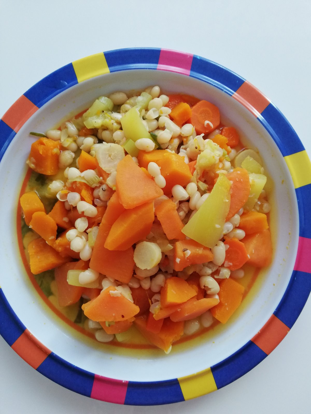 Teply fazulkovy salat z bielej malej fazulky(batat, hokaido, mrkva, petrzlen, mlada cibulka, cuketa)olivovy olej na vrch.