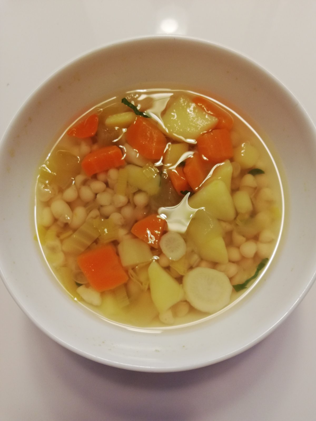 Polievka z bielej malej fazulky s petrzlenom mrkvou porom zemiakom a stonkovym zelerom sol korenie mleta rasca petrzlenova vnat.