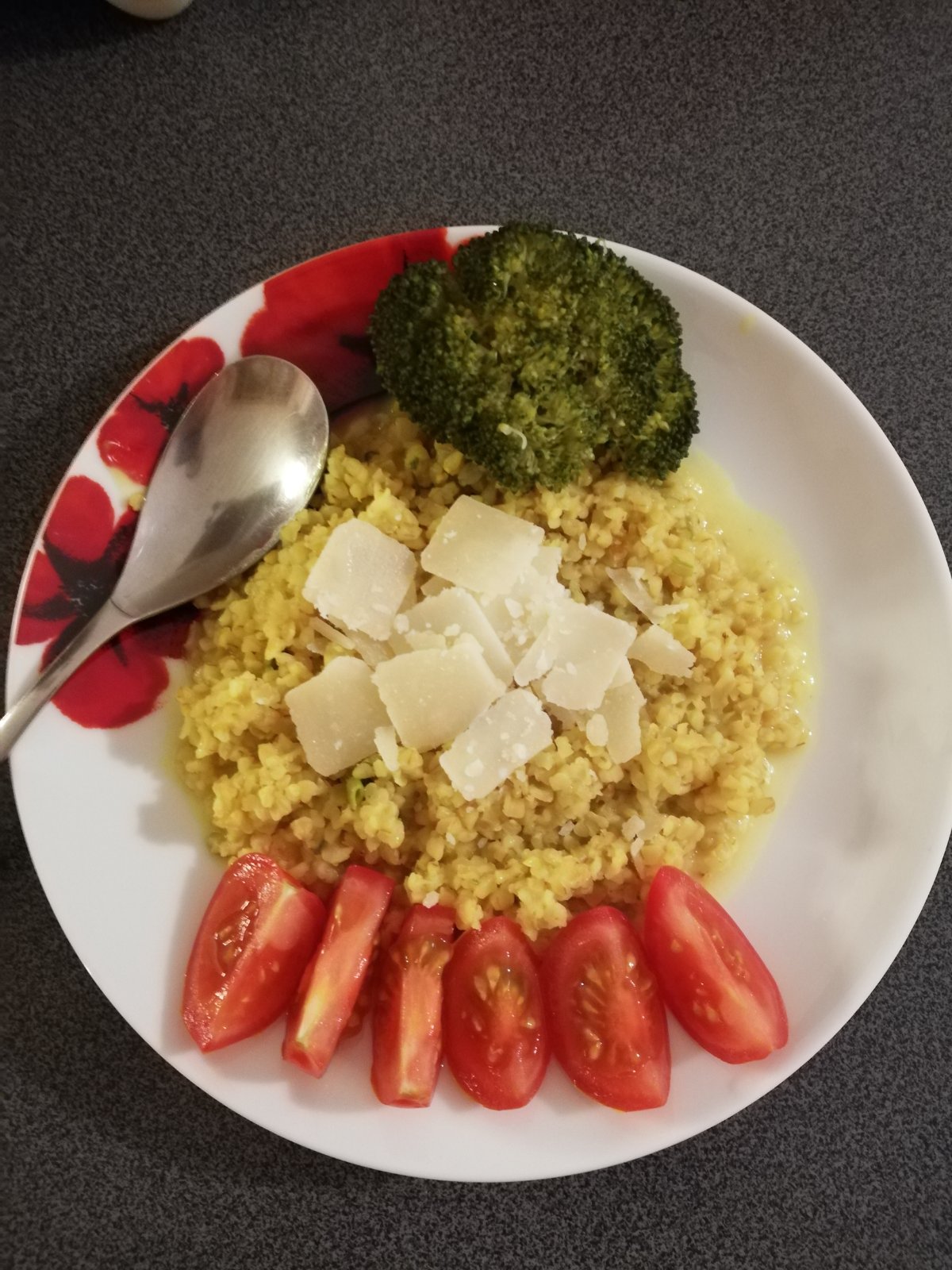 Bulgur(ghee, mlada cibulka, sol, kurkuma, ml. Rasca, cesnak) parena brokolica, cerstva paradajka,parmezan.