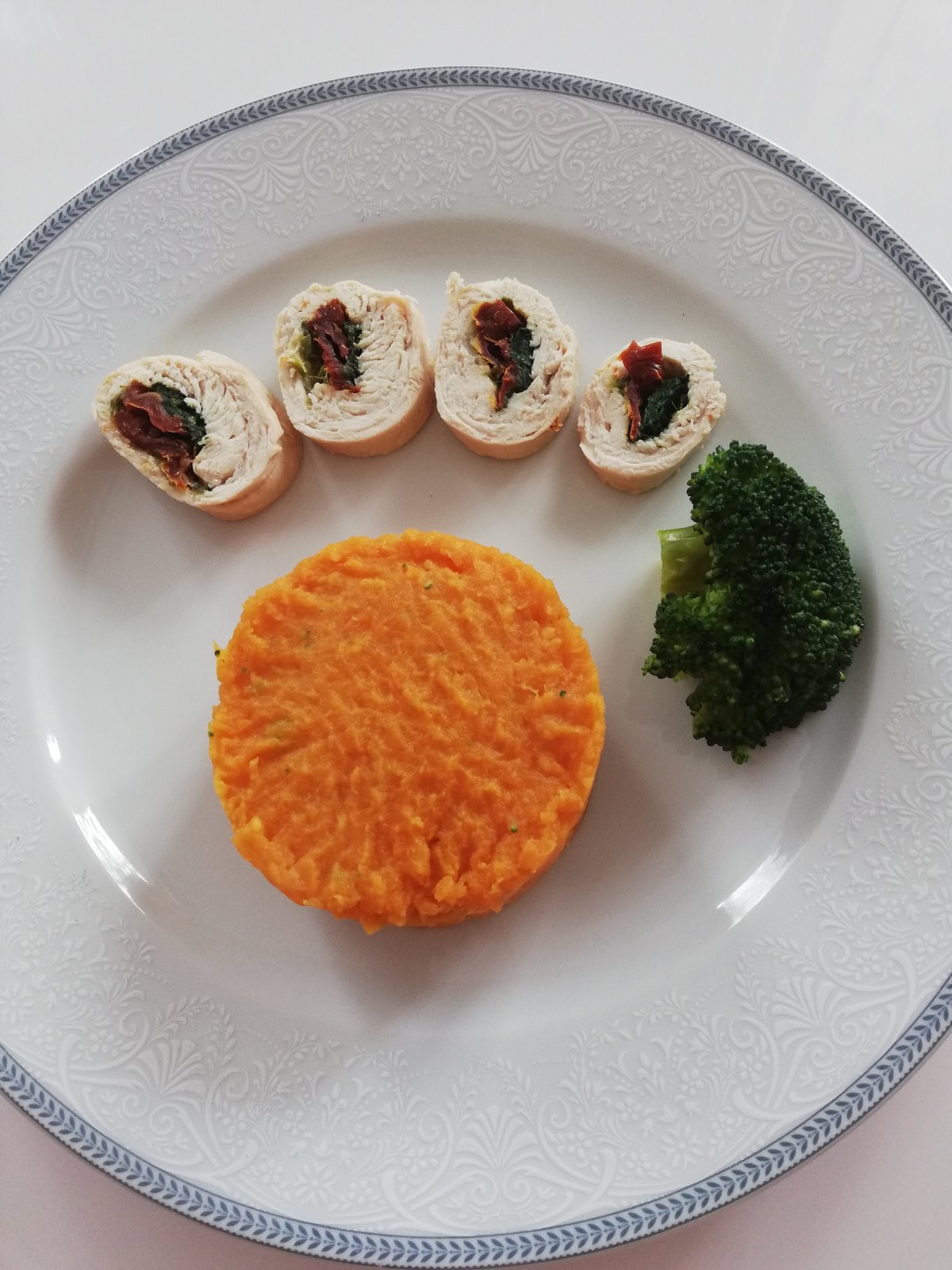 Morcacia rolada plnena sparenym spenatom, mladou cibulkou a susenymi paradajkami na olivaci osmahnut podliat a dusit, batatovo-mrkvove pyre, brokolica.