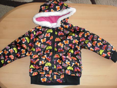 Teplá červená bundička s potlačou, kapucňa, zakončenie rukávov na gumu, spodok bundy tiež, zips. Dĺžka rukávu 26 cm. Veľkosť: 4 roky cca.104 – 110.
