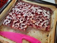 Vajcia vymiešať s cukrami, pridať olej, mlieko, jogurt (vždy v tomto poradí), a PREOSIATU (!!!) múku s práškom do pečiva. Polotekuté cesto vyliať na klasický veľký plech vyložený papierom na pečenie, dať na cesto ovocie, a piecť na 175 stupňov 40 min.