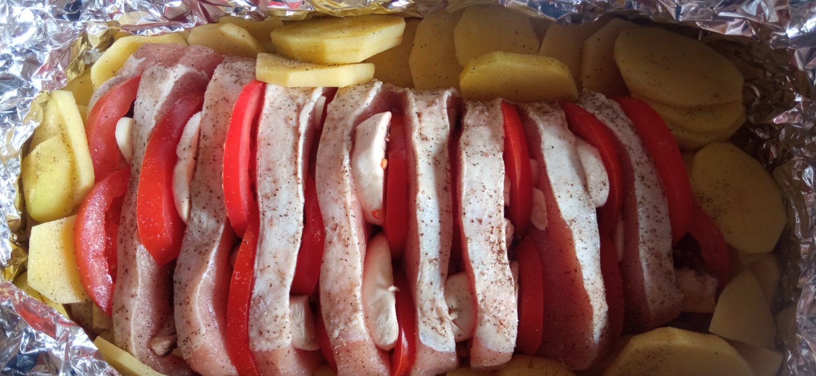 autor@marikaheidi mäso je namrinovane v oleji s grilovacím korením a kúskom kari,prerežeme a v rezov je tvrdý syr a paradka....piekla som zakryté na 180st 40min bez podlievania