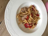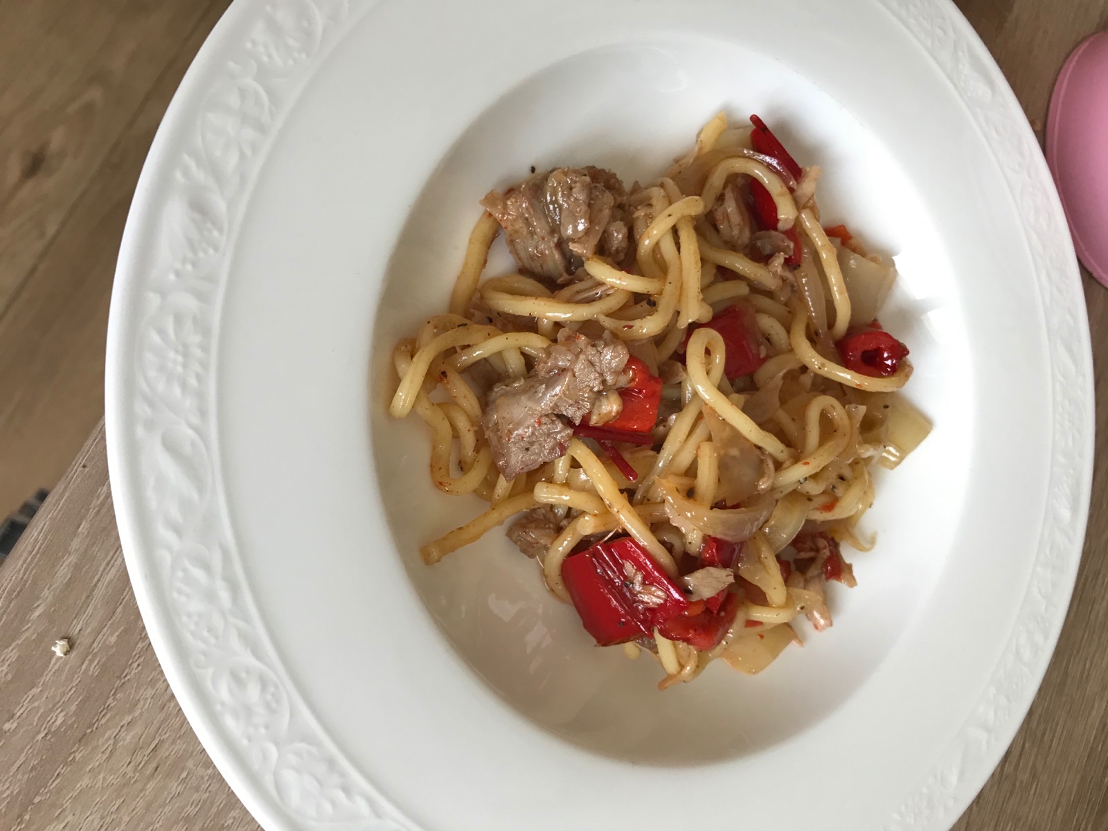 Ja som včera akurát robila takto: morčacie mäso udusené zvlášť v kuchte aby bolo aj pre malú 🙂 Na oleji vo woku cibuľa, paprika žltá a červená, paradajka, keď sa to ugrilovalo dala som masko, sójovku, medovicovy med, korenie štyroch farieb trocha ešte ugrilovala a potom som len vypla a vmiešala už uvarené rezance🙂