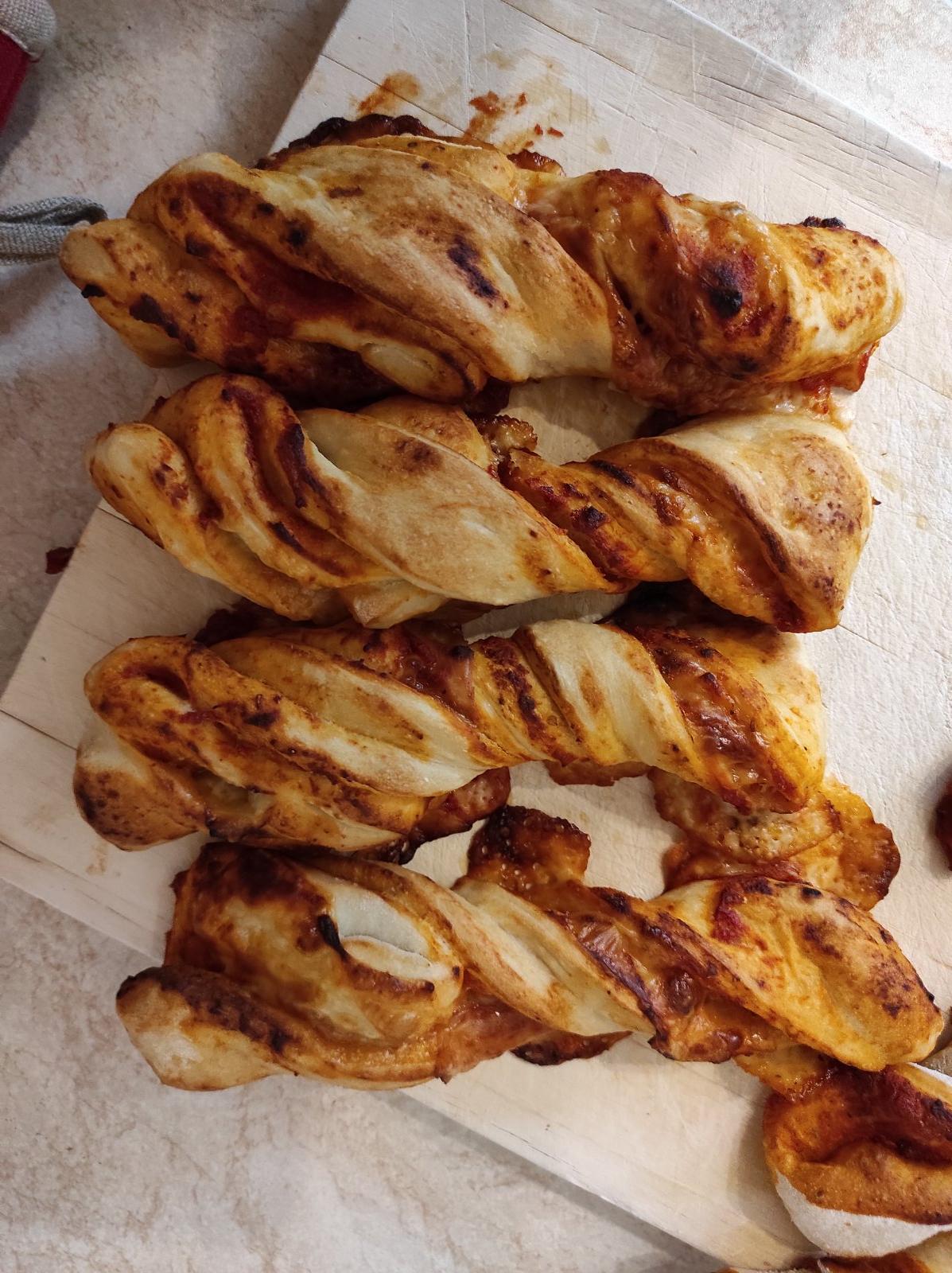 autor@alex1271 pizza cesto klasika...pol kg múky,lyická soli, 3/4 dcl oleja...a buď sušené droždie alebo kvások,voda podľa potreby aby vznikol vláčny bochník.(cca 270ml)...nechám vykysnut.potom som rozdelila cesto na dve časti,jednu vyvaľkala na obdĺžnik úplne natenko ,2/3 potrela zmesou:kečup,trocha oleja,soľ,pizza korenie,a posypala syrom. Suchou časťou som tonorekryla a ešte raz preložila...potom som vykrajovala tyčinky cca 2-2.5cm široké...a stocila ako vidíš na obrázku...a s druhým cestom to isté.piekla som na teplovzduchu 200st cca 15min...ja nepotieram pizza tyčinky pred pečením