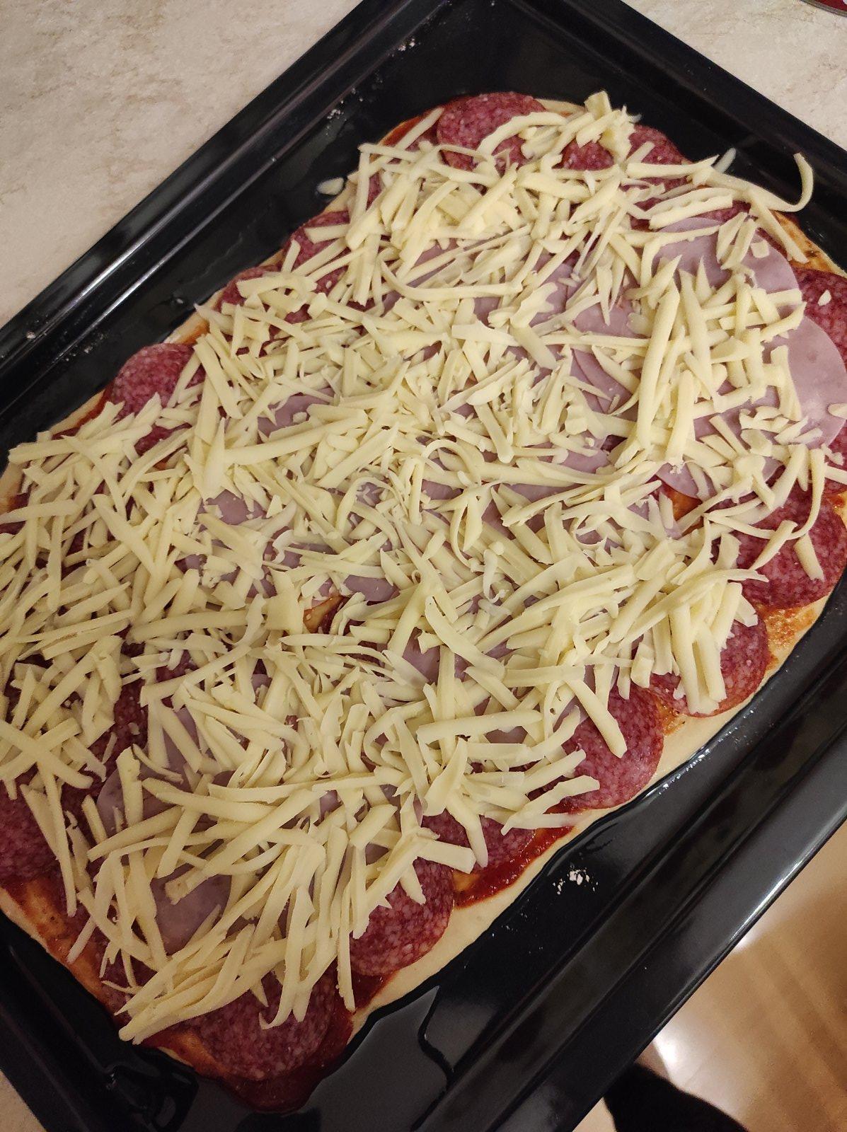 autor@fxcvikotova na veliky plech 60tky rúry: 300g múky,0.5dcl oleja,1 alebo pol sušeného droždia(ev.kvások),1cl soli a vody cca 190ml,prilievať pomaly(voda je ratana dokopy aj s kváskom).nasmie byť cesto riedke,ak by bolo na plech ho kľudne rukou vytapkam.ruku si Omastim olejom ktorým som si vymastila plech. Cesto môžeš aj vyvalkat.peciem 15min na 200st