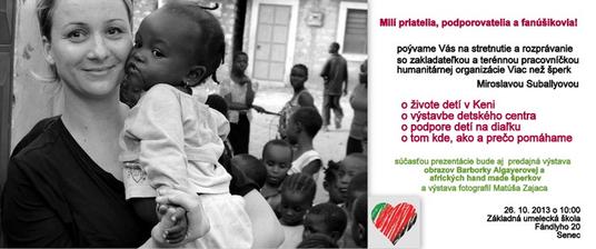 Ak ste zo Senca alebo aj nie 🙂 budeme radi, keď sa prídete na nás pozrieť osobne. Mirka bude rozprávať o práci Viac než šperk v Keni, o tom ako žijú deti v núdzi, ktorých je v regióne pôsobenia organizácie až 60%, o tom prečo pomáhame práve deťom a AKO im pomáhame. Čo sa nám za takmer 4 roky spoločnými silami podarilo a ako ešte viac môžeme zlepšiť životy ľudí, ktorým často chýba hlavne know how na to aby sa odrazili od dna biedy.