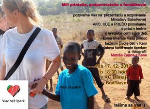 pozývame Vás na prezentáciu a rozprávanie o práci v teréne, o tom komu smeruje Vaša pomoc a ako dokáže meniť životy ľudí v núdzi a mnoho ďalších tém spojených s diskusiou, výstavou hand made šperkov a fotografií Matúsa Zajaca z Kene.
