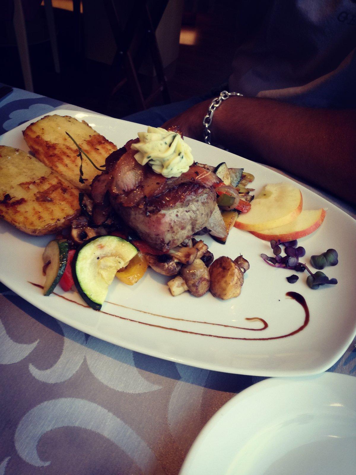 Steak mladý býk a opekaný zemiak+ gril. zelenina
