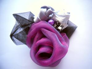 Brošňa - kvet vyrobený z premenlivej fialovej organzy, menšie kvety zo striebornej a šedej saténovej stuhy, čierna organza, korálky, povoskovaná fialová perla, veľkosť 8 cm, brošňové zapínanie. Cena 5,50 euro.