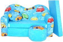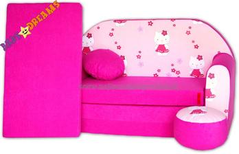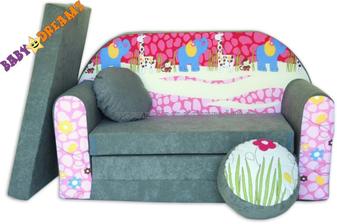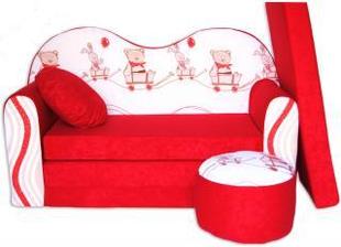 Rozkladacie detská pohovka s taburetkou a vankúšom. Jedinečná a praktická pohovka pre deti. Pohovka môže slúžiť i na spanie, odpočívanie, hranie, kreslenie alebo len na pozeranie televízie.