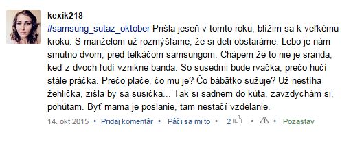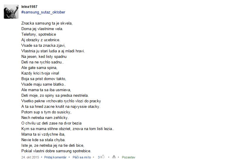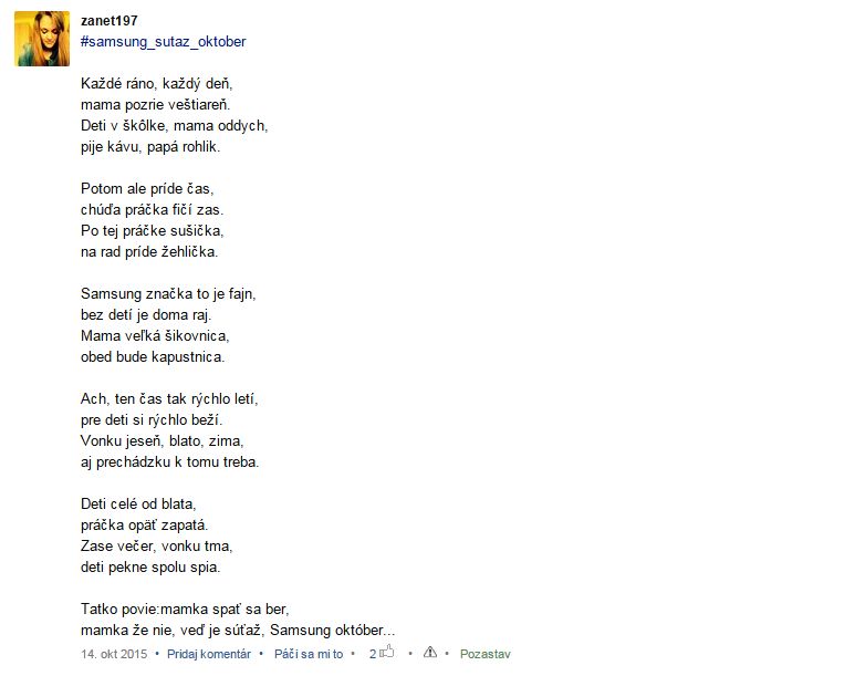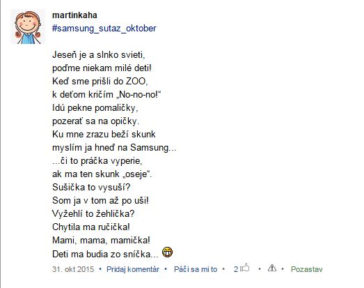 A aby táto ťažká úloha vybrať najkrjašiu básničku nebola na mne, nechávam to na Vás a to fortmou like pod fotku básničky ktorá sa vám najviac páči 🙂 A aby to nebolo zadarmo z likeujúcich mamičiek vyžrebujem jednu mamičku, ktorej samsung pošle malinký balíček darčekových predmetov 🙂