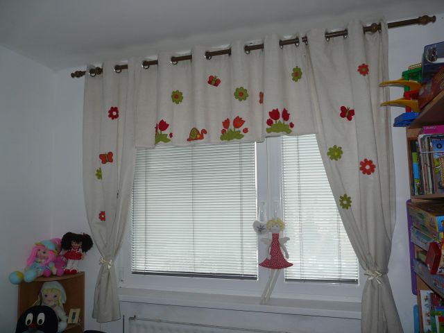zo starého - nové, tento záves som kúpila v sekáčiku, mamina mi ho prispôsobila podľa veľkosti okna a ja som na ňou ručne našívala a obšívala kvietky a motýliky. Nie vždy treba kupovať nové dá sa pozmeniť aj staré :-)