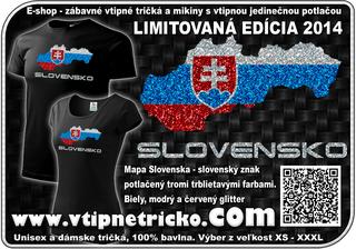 LIMITOVANÁ EDÍCIA 2014 - Unisex tričko Mapa Slovenska - slovenský znak potlačený tromi trblietavými farbami - biely, modrý a červený glitter. Viac info na: http://www.vtipnetricko.com/16-tricko-panske-da...